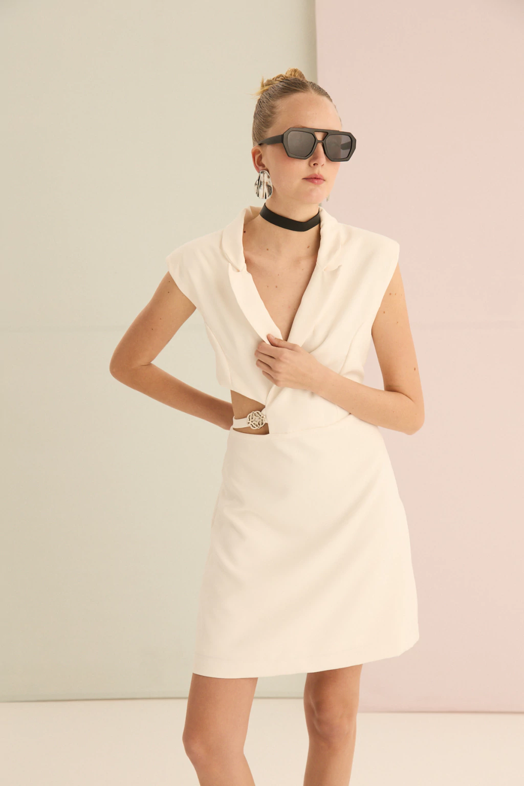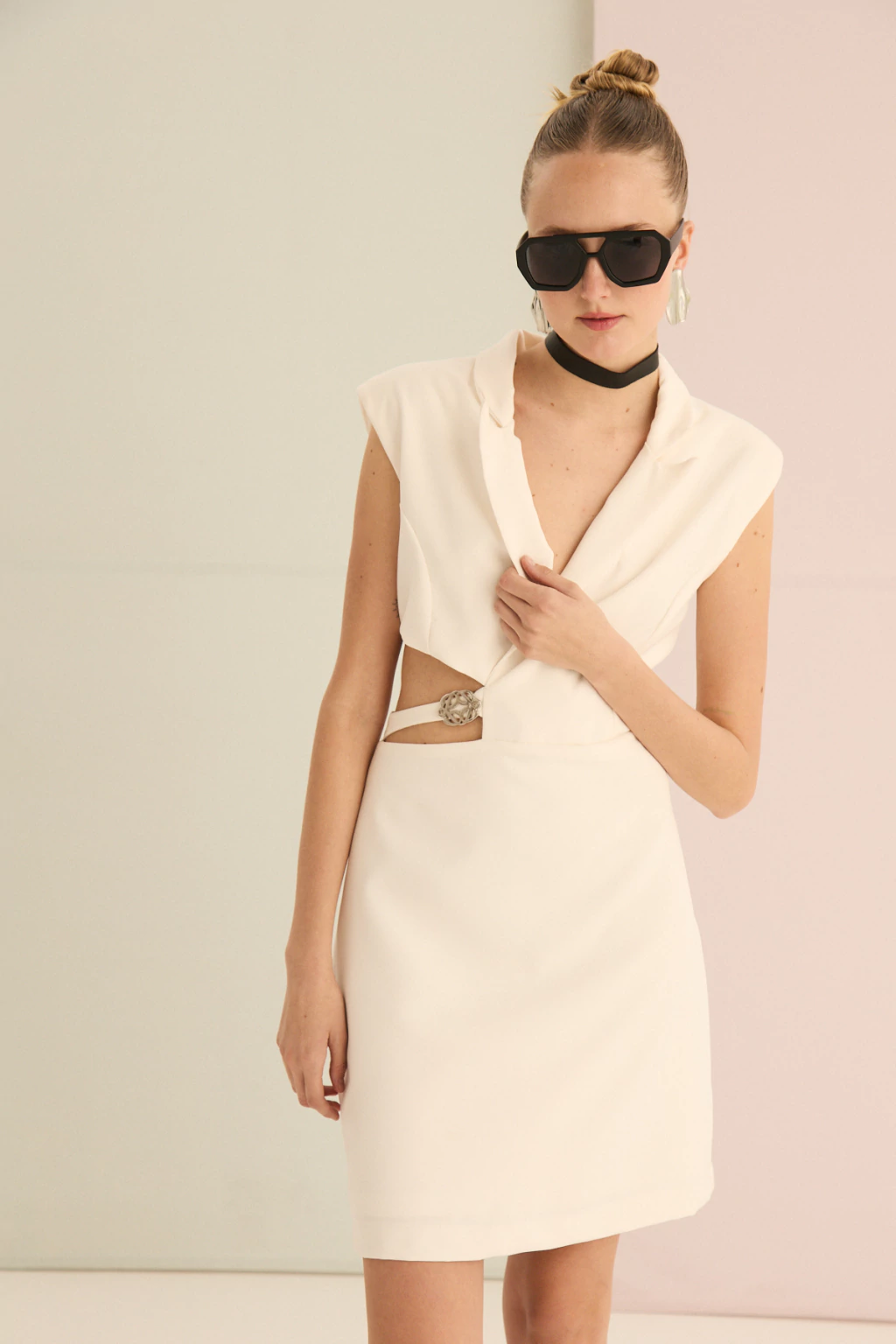Vestido corto confeccionado en tejido sastrero de alta calidad. Presenta una hebilla lateral Prussia metálica que ajusta y define la silueta. Corte recto, escote redondo y terminaciones pulidas.