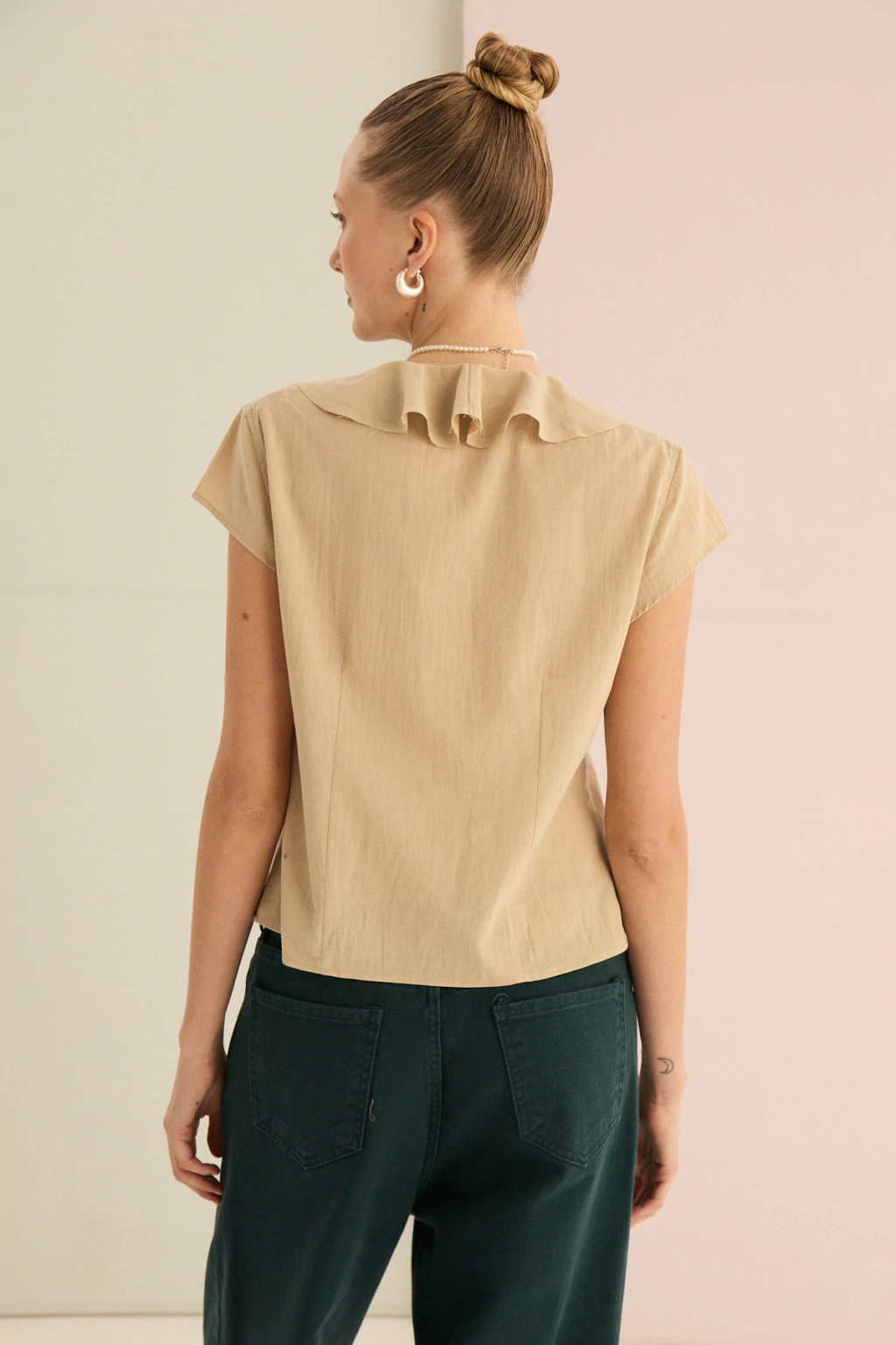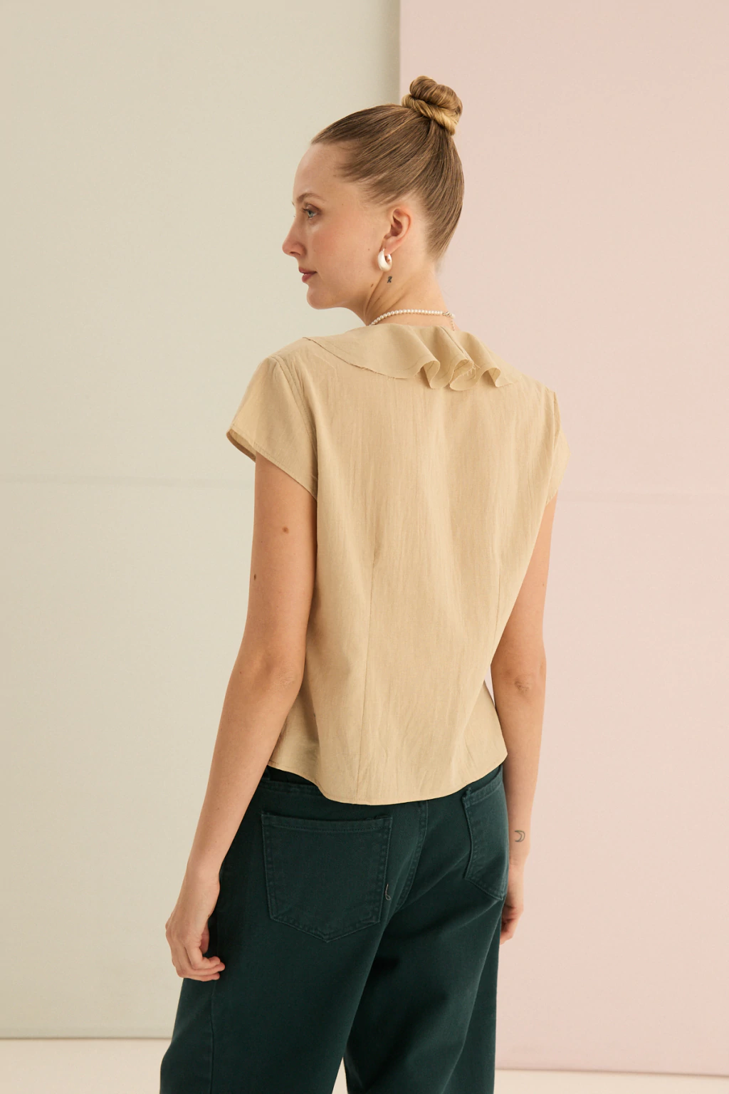 Descubrí la blusa con volado en escote que redefine la elegancia femenina. La Blusa Anne se distingue por su delicado volado en el escote, que aporta un toque romántico y sofisticado a cualquier look. El acceso con cordones en tela base permite un ajuste personalizado y cómodo, realzando la silueta de manera sutil.