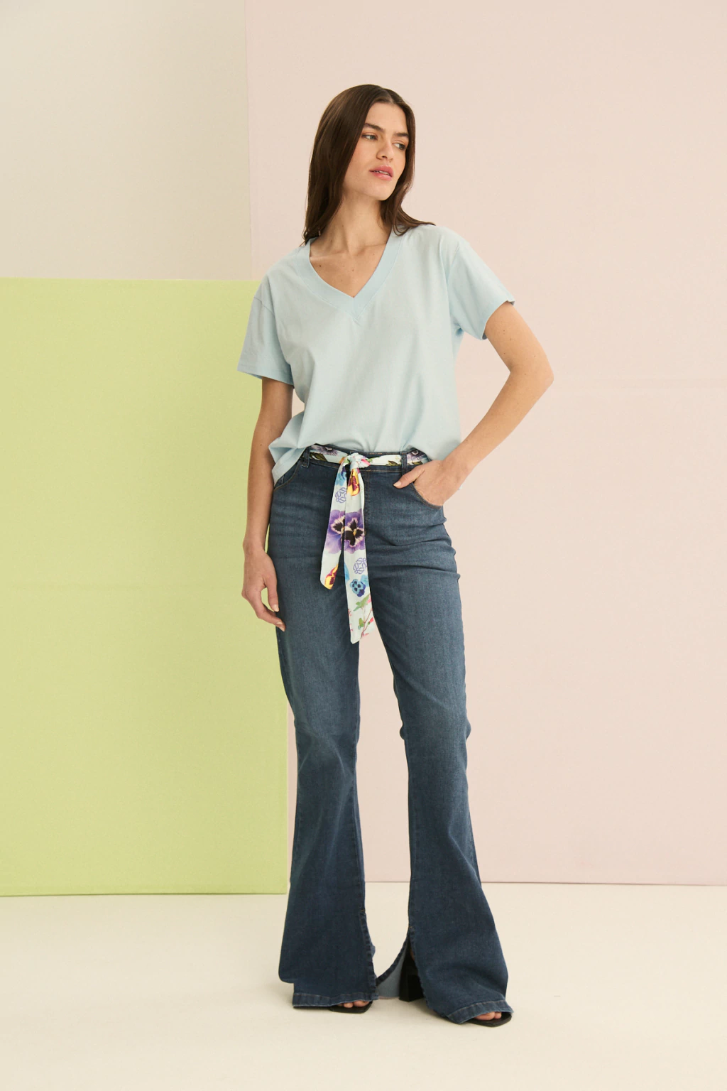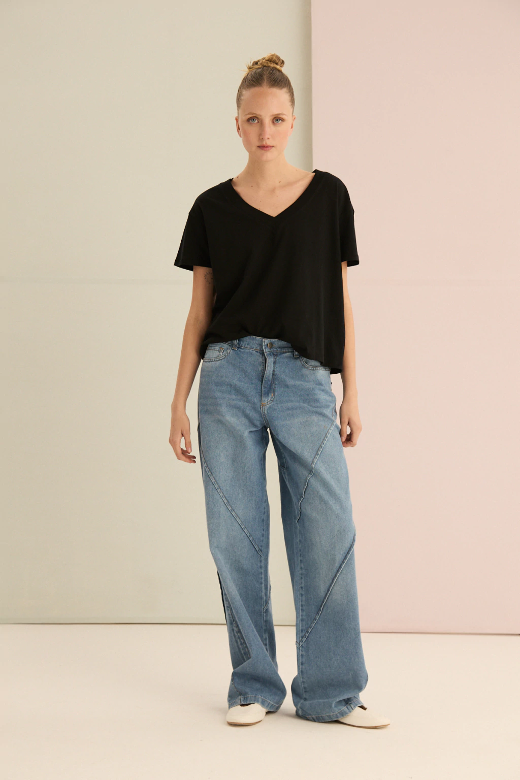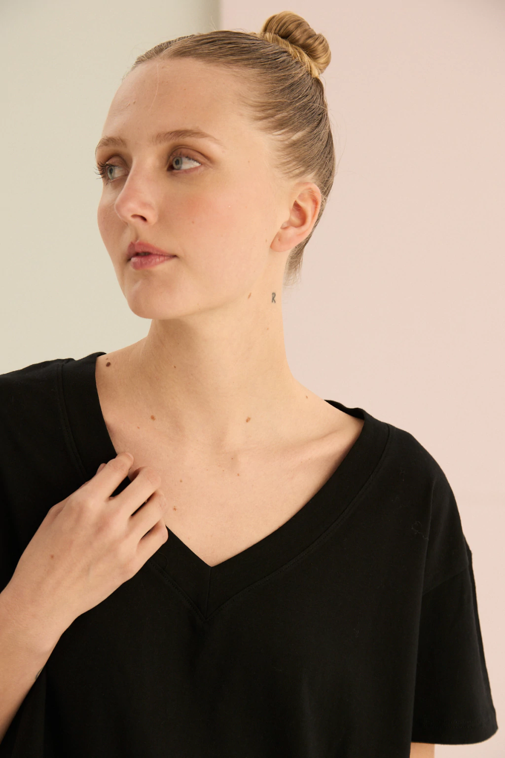 La Remera Esme destaca por su fit relaxed y elegante escote en V, ideal para quienes buscan una prenda simple y chic. Confeccionada en jersey de algodón suave, garantiza frescura y confort en cualquier ocasión.