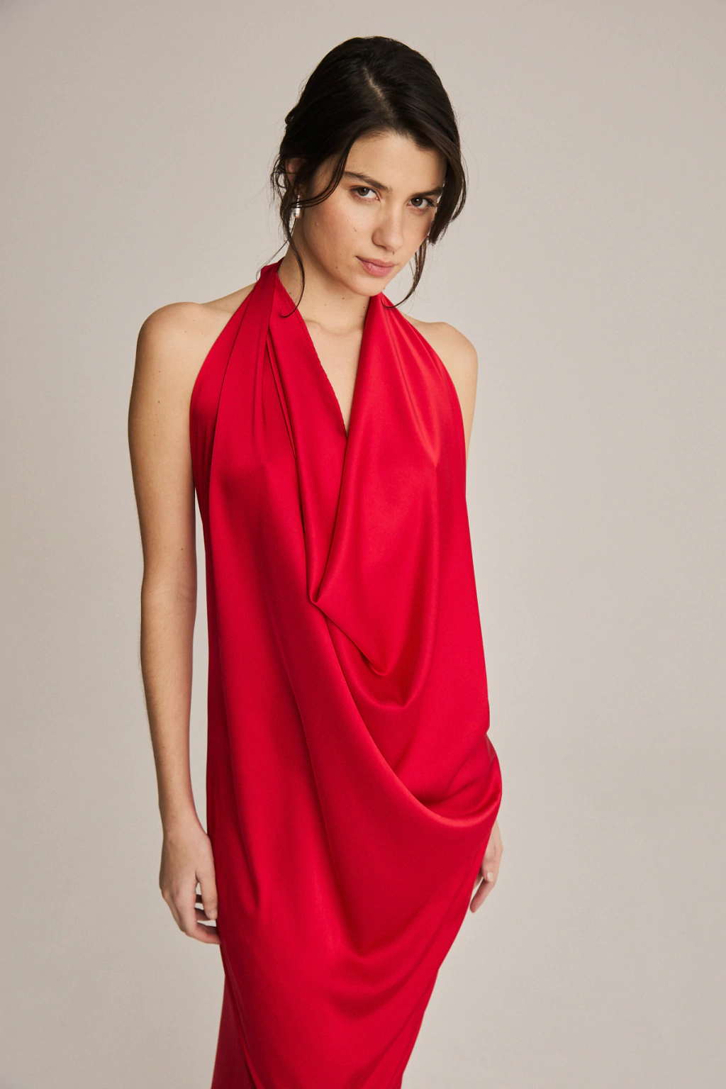 El Vestido Meline Rojo es una prenda midi confeccionada en sedita, destacada por su escote buche y espalda descubierta. Su diseño ofrece un ajuste preciso que realza la silueta y aporta fluidez en el movimiento.