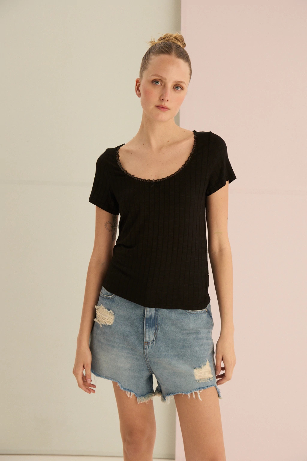 Descubrí la Remera Cecile, la pieza ideal para sumar un toque romántico y sofisticado a tu guardarropa. Su escote amplio resalta el cuello y aporta feminidad, mientras que el detalle de puntilla y moño lencero le otorga un aire delicado y único.