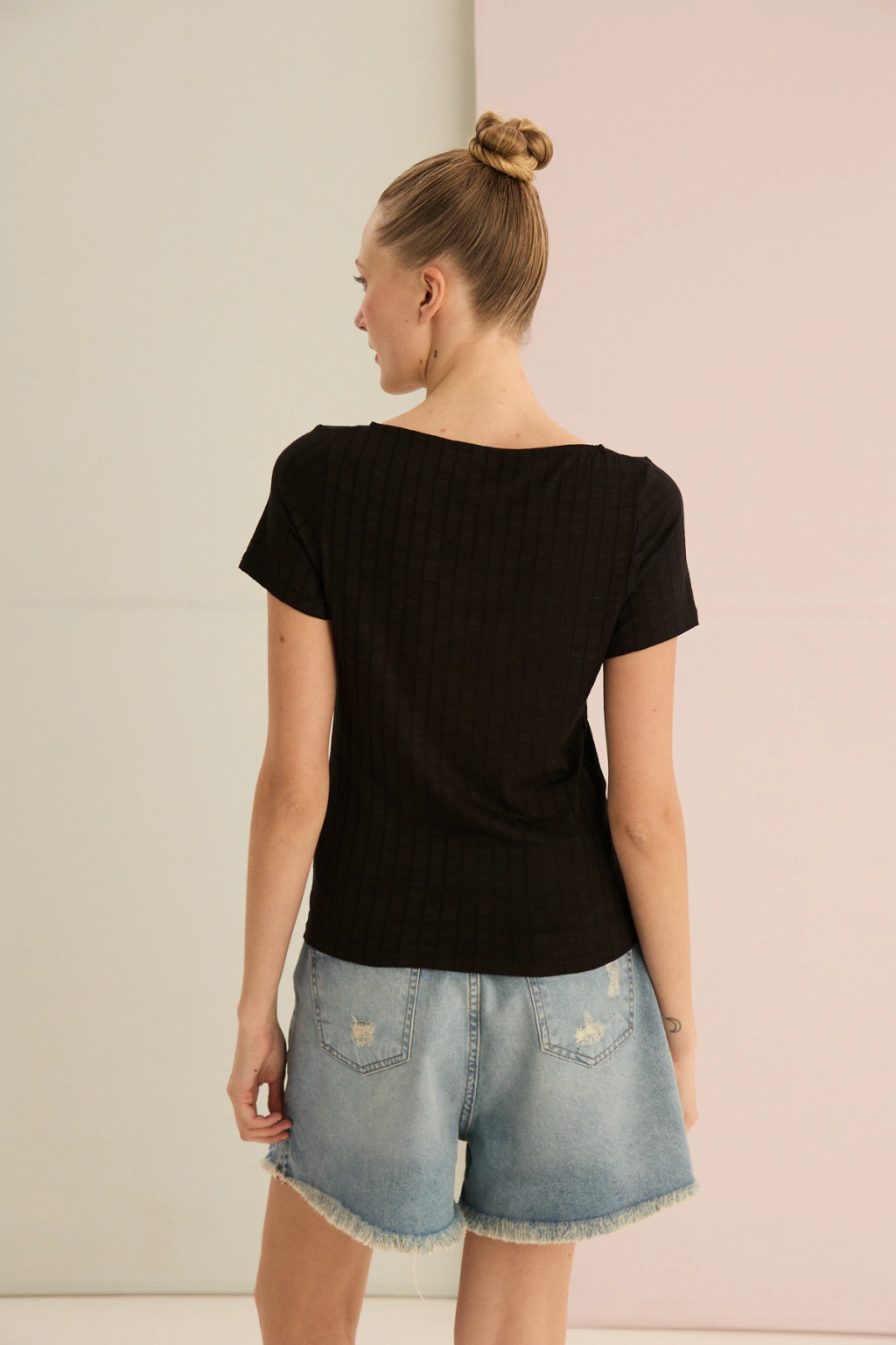 Confeccionada en suave Morley flame, esta remera ofrece frescura, elasticidad y una caída ligera, adaptándose perfectamente a tu silueta. Es una prenda versátil, perfecta para ocasiones casuales o para elevar un look de noche con elegancia.